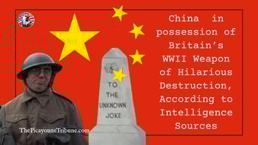 Intelligence reports have surfaced indicating that the infamous "killer joke" from World War II has resurfaced and is now in the hands of the Chinese government. The joke, which was weaponized by the British during the war, is said to be so jocular that it caused instant death by laughter upon hearing.