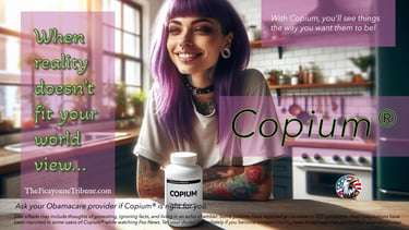 Warning: Do not take Copium® while watching news channels that challenge your perspective. This may result in uncontrollable rage, shouting at the TV, or throwing objects at the screen. If you experience prolonged exposure to opposing viewpoints, consult your doctor immediately.