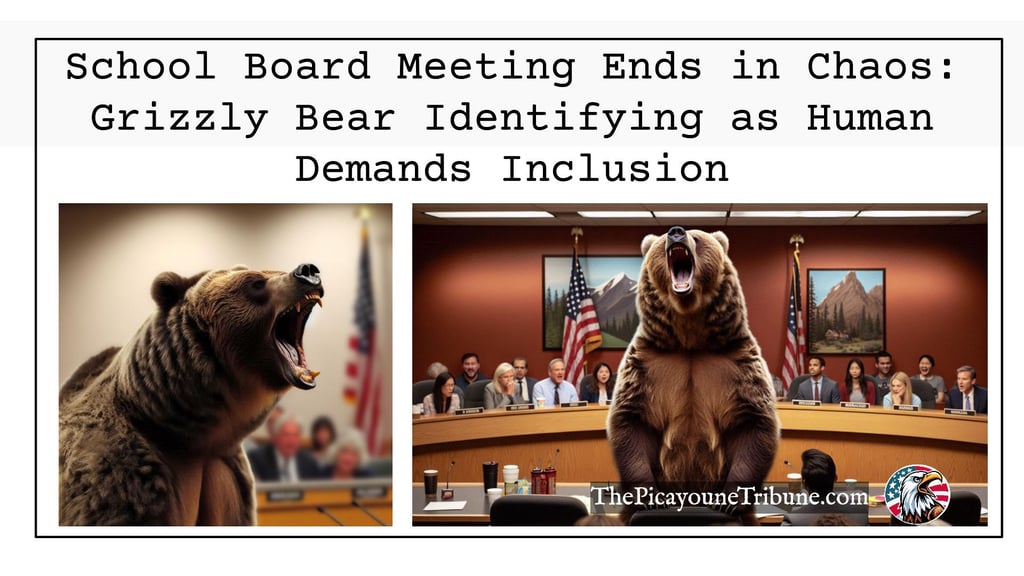 A local school board meeting descended into chaos last night when a 900-pound grizzly bear, identifying as human, insisted on participating in discussions about locker room policies. The meeting, held in compliance with new inclusivity guidelines, ended tragically with two board members dead and five hospitalized after the bear, known as "Barry," became agitated during a heated debate.